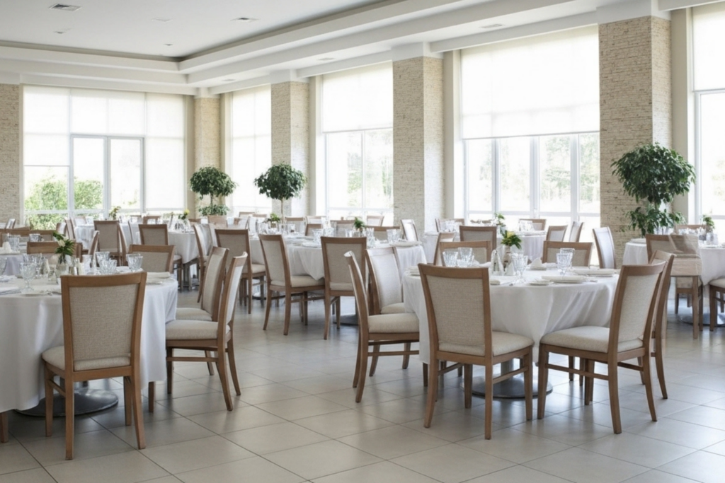 Um salão amplo e iluminado pela luz natural, com mesas delicadamente preparadas, transmite sofisticação e acolhimento. O ambiente harmoniza tons claros, plantas decorativas e organização impecável, criando o cenário perfeito para celebrações, encontros especiais e experiências memoráveis.